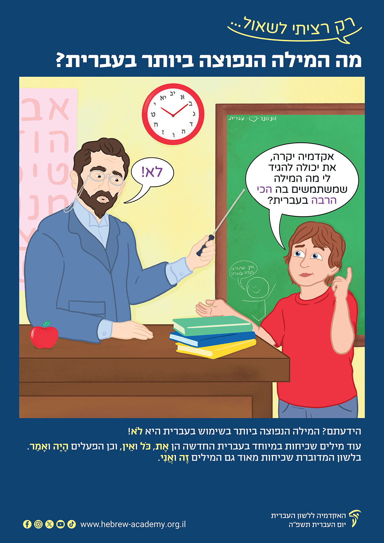 We play a leading role in marking Hebrew Language Day, יוֹם הָעִבְרִית (in full: יוֹם הַלָּשׁוֹן הָעִבְרִית), an annual tribute to Hebrew held on 21 Tevet, the Hebrew birthday of Eliezer Ben-Yehuda (or on a nearby weekday, if 21 Tevet falls on a weekend). The Israeli government established the day as part of a November 18, 2012, resolution aimed at bolstering knowledge of and connection to the language, both in Israel and abroad, in recognition of the importance of Hebrew to Israeli and Jewish identity and culture. Every year, more media outlets, organizations, and communities join in commemorating the day. The Academy marks the occasion with diverse activities and initiatives that reach hundreds of thousands of Hebrew speakers. Over the years we have sponsored well-attended lectures and other events; produced and disseminated engaging educational posters; held a vote for Word of the Year; published special posts on our social-media channels; and partnered with others to present content about the language in the media and on consumer products (e.g., milk cartons). In addition, our Hebrew website offers an abundance of programming, including videos, quizzes, lesson plans, and lectures, free of charge.